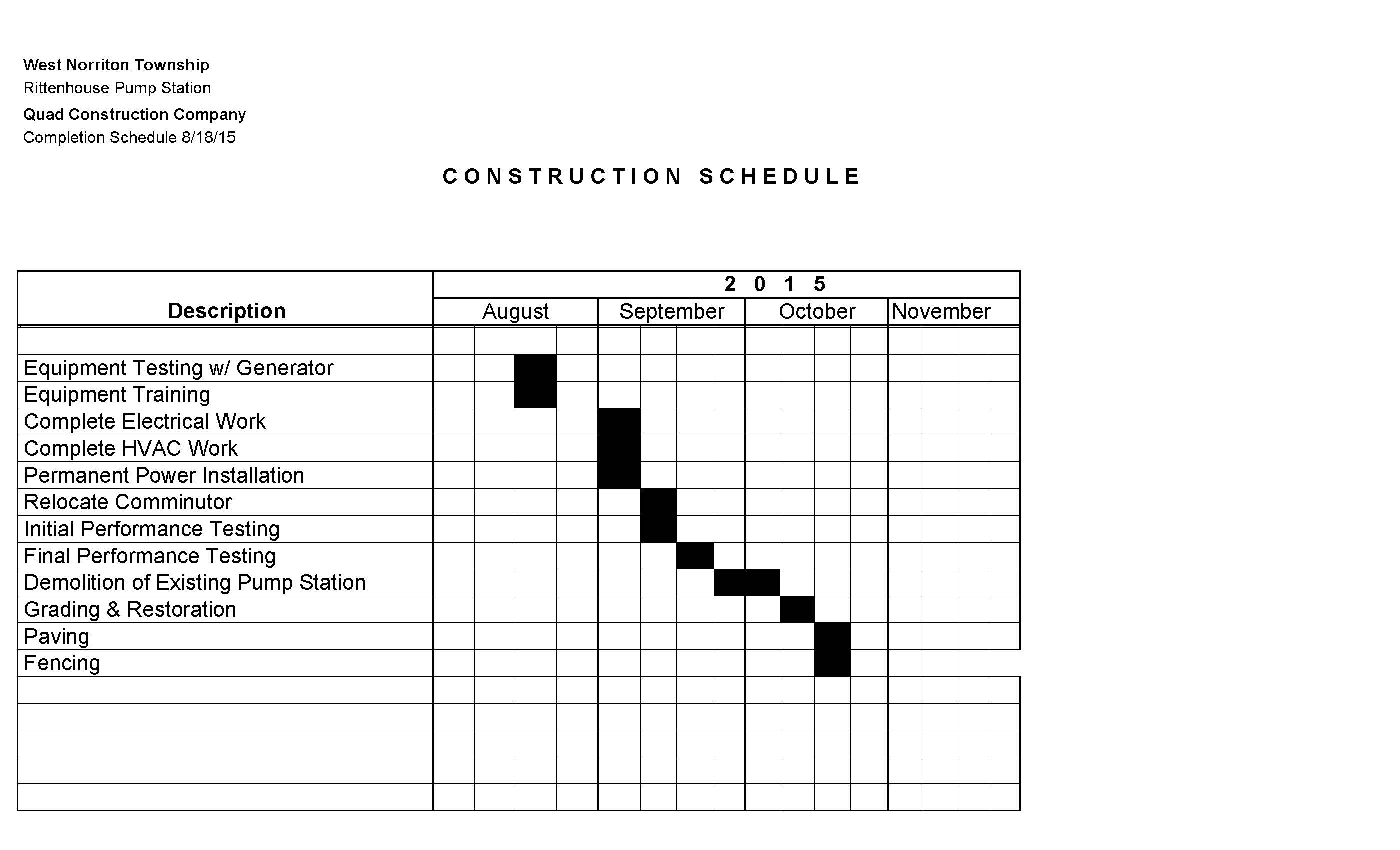 | Pump Station Building Construction | 4/16/15 | 5/4/15 |